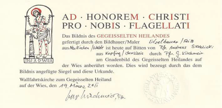 Auf Initiative von Pfarrer Andreas Skoblicki fertigte der Bildhauer Litzl- bauer eine Kopie des Kopfinger Wiesheilands an. Diese wurde dann am 19. März 2011 im Rahmen der Pfarrwallfahrt nach Oberbayern in die Wieskir- che gebracht, um dort den Original- wiesheiland zu berühren. Die